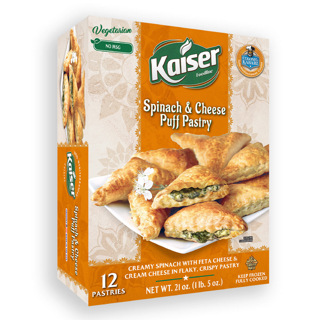 Experience the delicious and natural flavor of Kaiser Spinach and Cheese Puff Pastry, which is crafted with layers of fluffy puff pastry. Each pastry is generously stuffed with Creamy spinach and feta cheese blended with cream cheese.