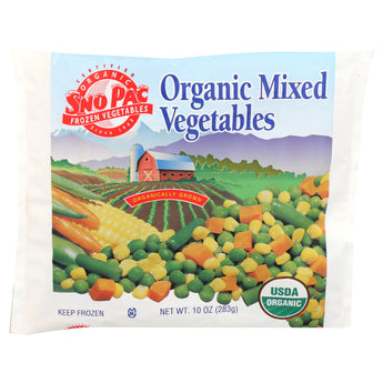 A colorful blend of organic peas, corn, green beans, and carrots. Use these classic midwestern veggies to create countless delicious dishes. Sno Pac products are organically grown, USDA certified, and picked at peak freshness, and frozen quickly without preservatives.