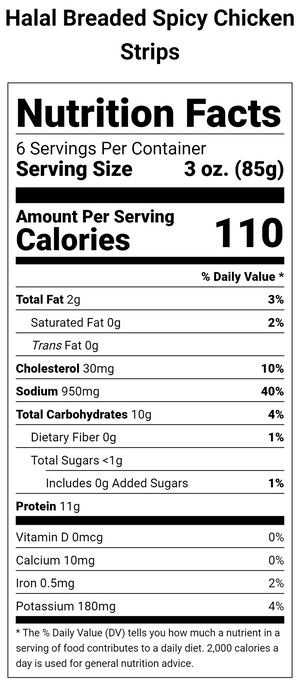 Midamar is proud to introduce our NEW Spicy breaded Halal Chicken Tenders. Lightly battered and breaded, our Halal Spicy Chicken Tenders are made from whole-muscle white breast meat - not chopped and formed poultry like other brands. It is coated in a flavorful spicy sauce that brings the heat. Our fully-cooked chicken tenders are great for lunch! Midamar Halal Chicken Tenders are free of Trans Fats, High Fructose Corn Syrup, and MSG.