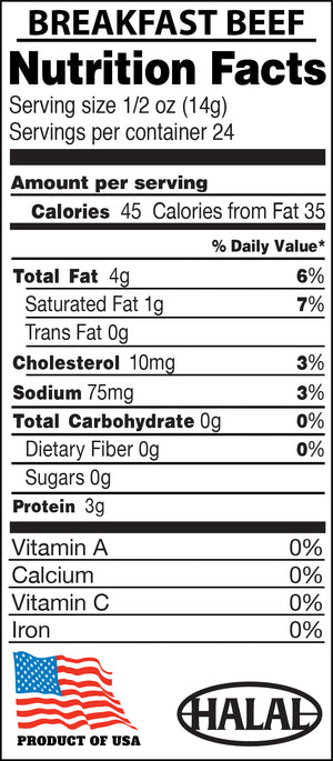 Many have tried to duplicate our award-winning Beef Breakfast Strips but there remains only one brand that leads in satisfying customers, Midamar. Our Halal Breakfast Beef is perfect on its own, in a BLT or fried with eggs, in a salad, or on pizza. Perfectly smoked and made with top quality Midwestern Halal beef with absolutely no MSG or fillers.
