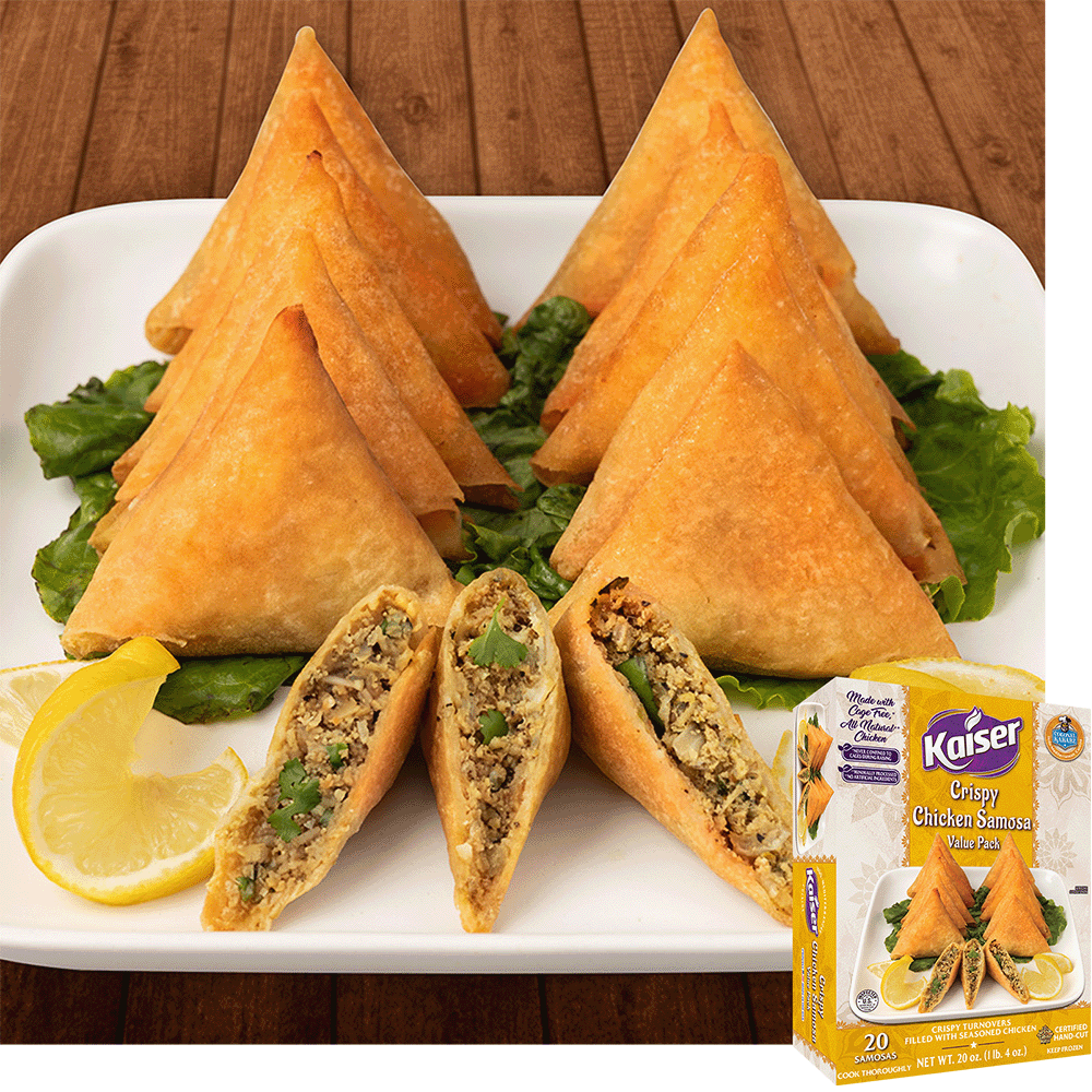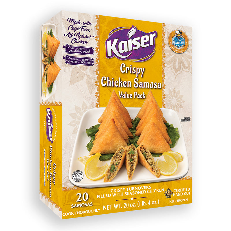 Experience the delicious and natural flavor of Kaiser Crispy Chicken Samosa, which is crafted with a crispy wrapper that’s made from scratch. Each samosa is generously stuffed with all-natural Halal chicken, seasoned with an exquisite blend of spices. Made with no artificial ingredients and minimally processed for a wholesome and delicious snack or appetizer. The Crispy Chicken Samosa Value Pack includes 20 delicious samosas for more of the flavor you love.